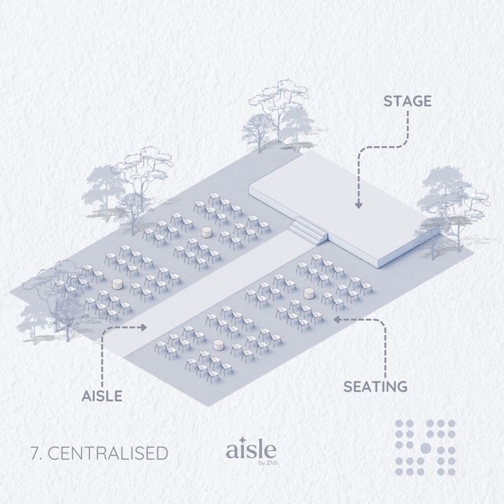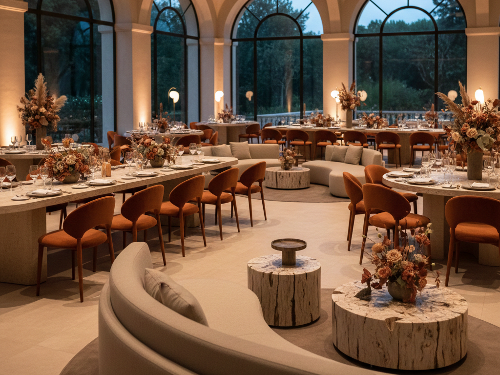 Una de las grandes tendencias en el diseño de bodas es la ruptura de las líneas rígidas. Estamos viendo una transición hacia mobiliario con formas orgánicas y curvas que invitan al movimiento. Las mesas imperiales infinitas se mezclan con configuraciones circulares y salas tipo lounge que utilizan materiales pétreos, terciopelos de alta densidad y metales cálidos.